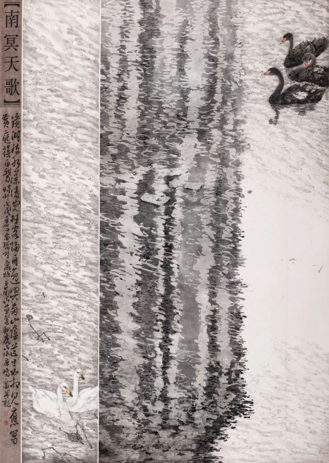 展览作品统一于对笔墨本质的追寻与展现。线条不仅是勾勒形体的边界,更是情感与力量的轨迹——时而如高山坠石般铿锵有力,时而如行云流水般婉转自如。墨色不仅是模拟物象的工具,更是心境与氛围的渲染——或浓墨重彩如盛夏之蓬勃,或淡墨轻岚似秋月之清朗。